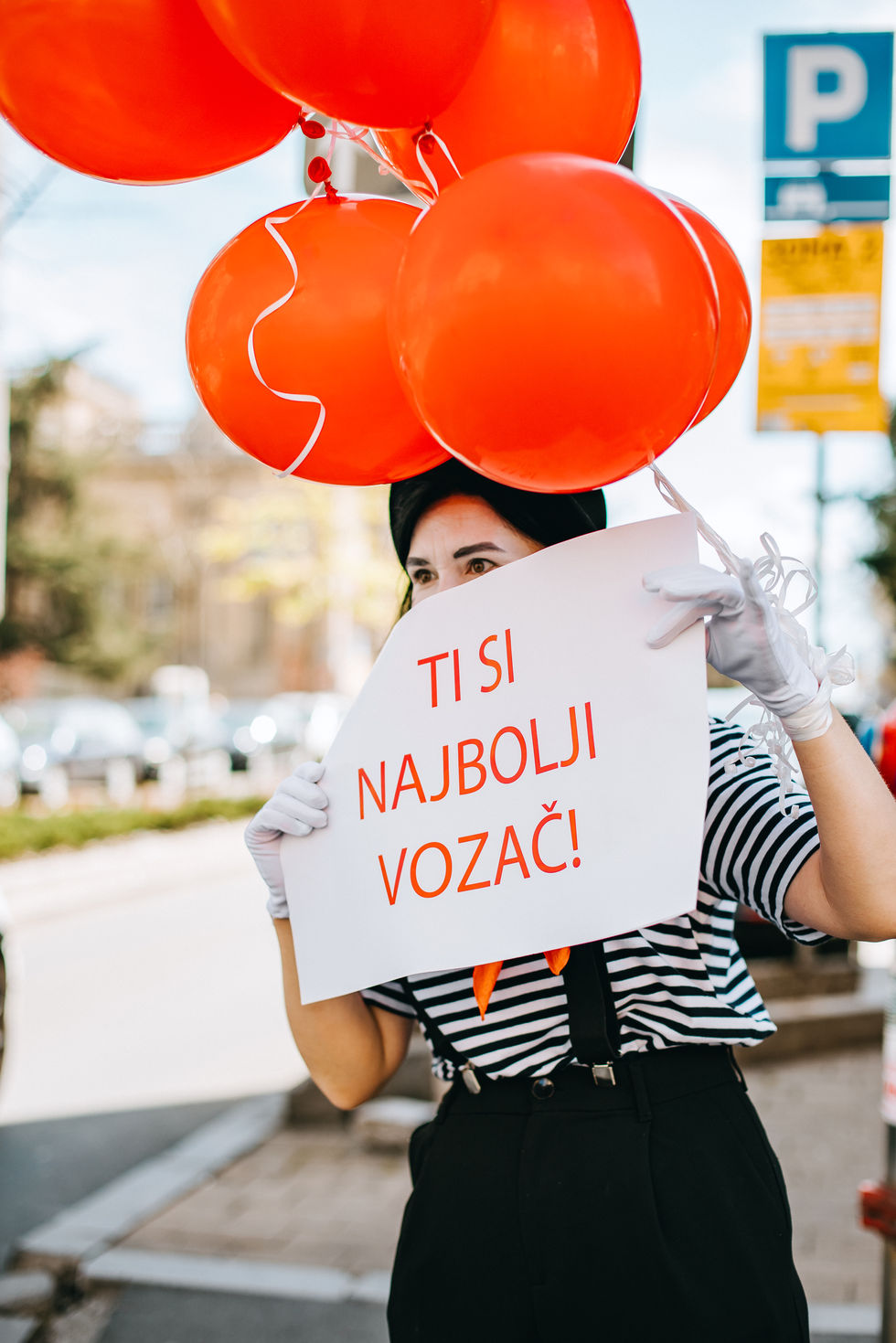 White makeup, a striped shirt, red accents and balloons — a familiar image that feels easy to approach.