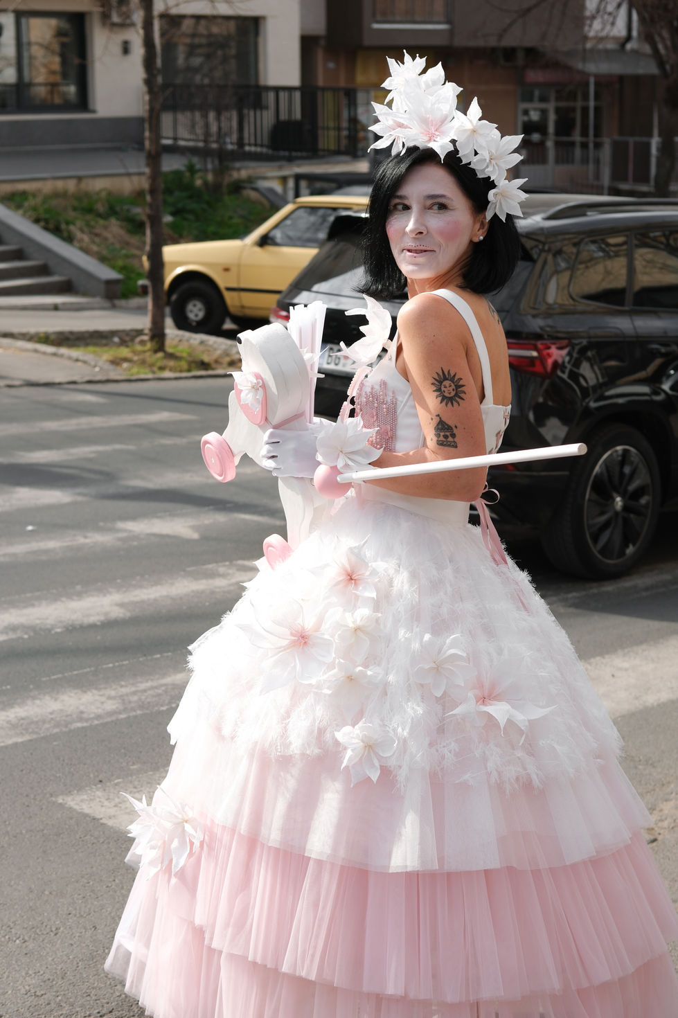 In her hand — a small white wooden poodle, a child’s toy on wheels. A symbol of tenderness.